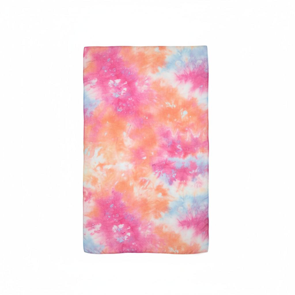 The scarf is a soft, flowing accessory with a delicate blend of colors, including pink, orange, and hints of purple and blue. The pattern is beautiful it has a watercolor or tie-dye effect, giving it a dreamy and artistic look. The fabric is lightweight, made from silk providing a gentle and elegant drape.
