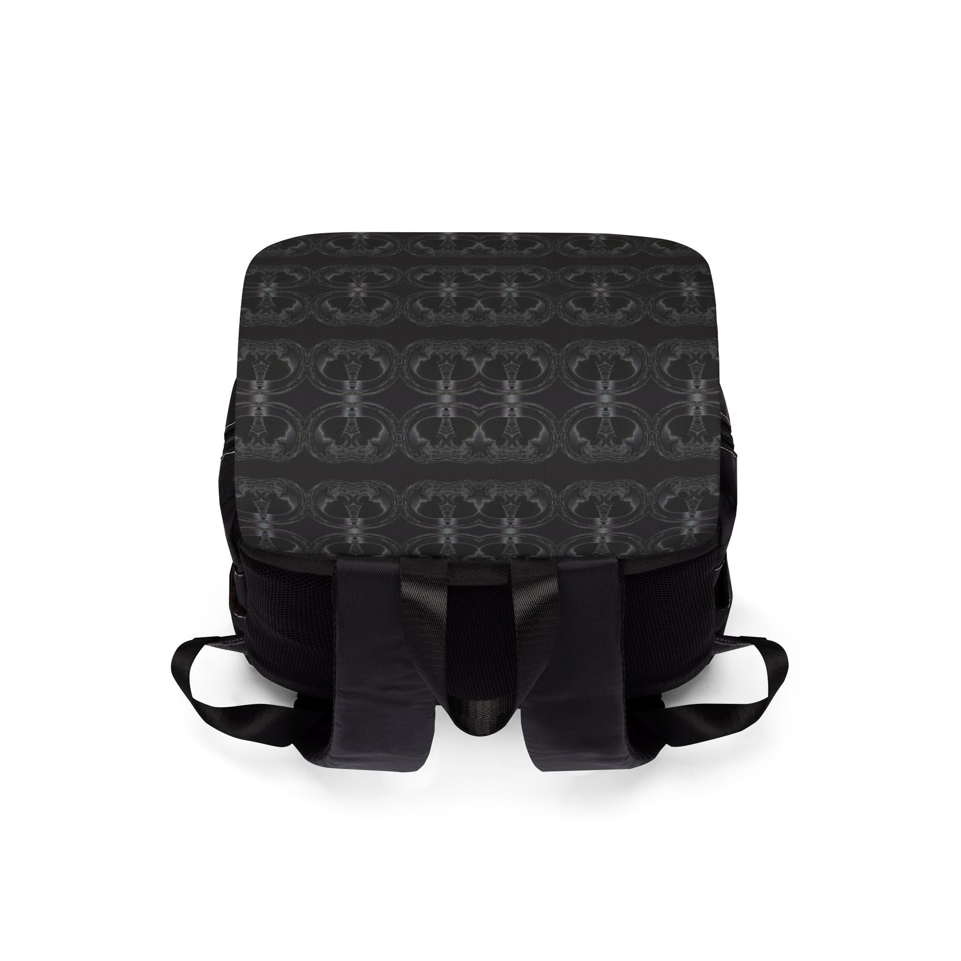 A compact, everyday canvas backpack with a low-key, urban edge. The matte black base and patterned flap give it a quietly modern look that moves from commute to coffee shop without fuss. Inside, thoughtful pockets organize a water bottle, chargers, and daily essentials, while the padded mesh back and adjustable straps make longer wear surprisingly comfortable. It’s the sort of bag that settles into your routine — carrying what you need without shouting for attention.